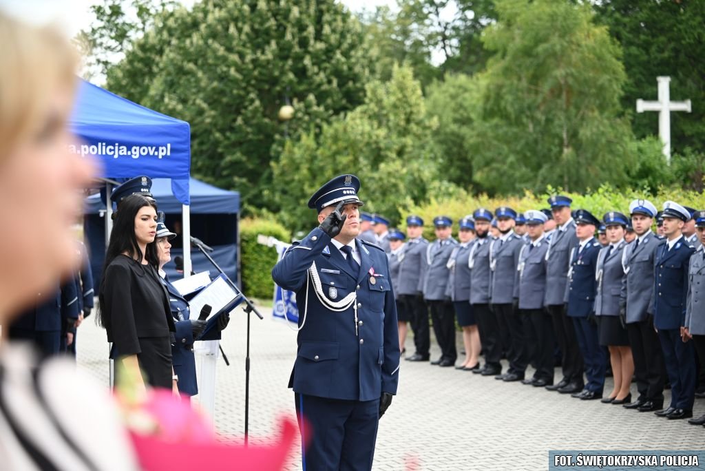 Po zakończeniu mszy, kwadrans po godzinie 13.00 odbył się uroczysty apel, który rozpoczął się złożeniem meldunku Pierwszemu Zastępcy Komendanta Wojewódzkiego Policji w Kielcach inspektorowi Tomaszowi Jaroszowi przez dowódcę uroczystości nadkomisarza Tomasza Siudę.