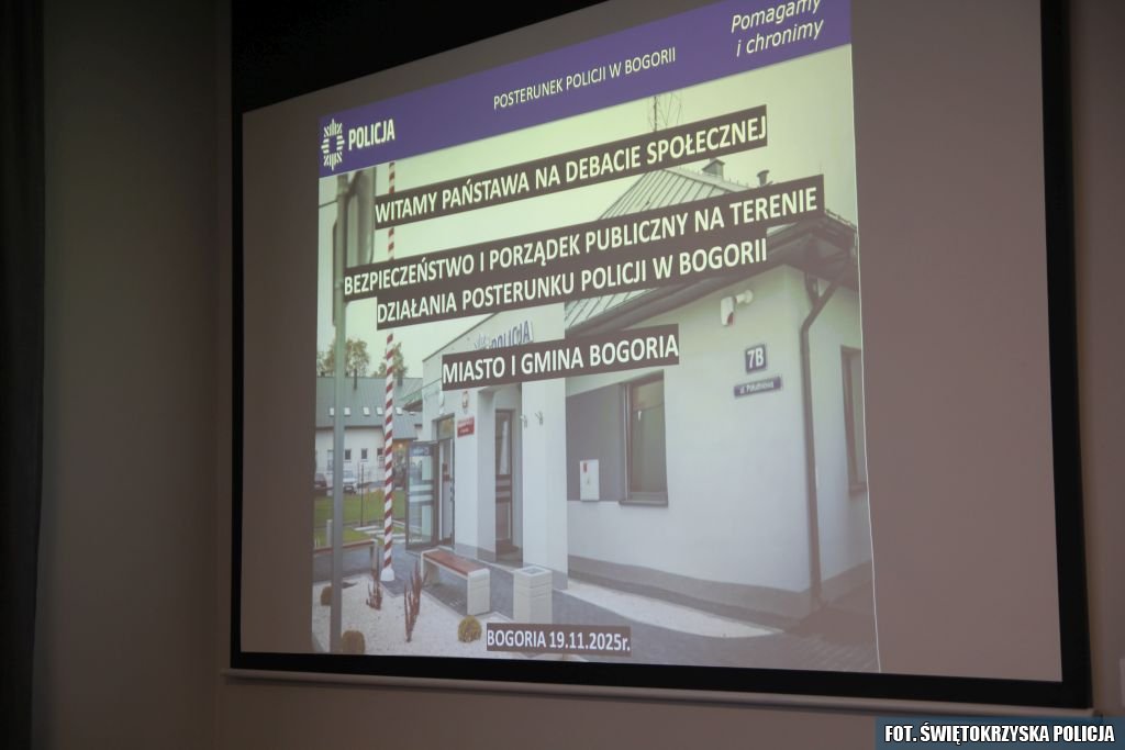 Dzisiaj w budynku urzędu Miasta i Gminy w Bogorii odbyła się debata społeczna oceniająca roczną, po jego odtworzeniu, działalność Posterunku Policji w Bogorii. Celem debaty było omówienie funkcjonowania Posterunku jako nowej jednostki na mapie, bezpieczeństwa w powiecie staszowskim, przedstawienie działań podejmowanych przez pełniących tam służbę funkcjonariuszy oraz zdiagnozowanie potrzeb i oczekiwań lokalnej społeczności w obszarze poprawy bezpieczeństwa, a także przybliżenie metod i sposóbów działania sprawców różnego rodzaju oszustw. Stan bezpieczeństwa w gminie Bogoria przedstawił Kierownik Posterunku Policji w Bogorii asp. szt. Damian Nowiński. Kierownik zaprezentował dane statystyczne dotyczące stwierdzonych przestępstw i wykroczeń na terenie gminy Bogoria za 12 miesięcy funkcjonowania Posterunku. Omówiona również została działalność profilaktyczna dzielnicowych jako policjantów pierwszego kontaktu. W dalszej części omówione zostały zagadnienia związane z działaniem Krajowej Mapy Zagrożeń Bezpieczeństwa oraz aplikacją Moja Komenda. Policjantka z Posterunku Policji w Bogorii asp. szt. Mariola Krupa omówiła mechanizmy działania sprawców oszustw oraz przestrzegła jak się przed nimi chronić. W bloku tematycznym przeznaczonym na dyskusję pojawiły się wnioski, a także propozycje działań ukierunkowanych na poprawę bezpieczeństwa mieszkańców.