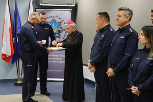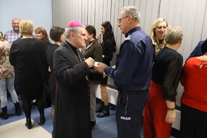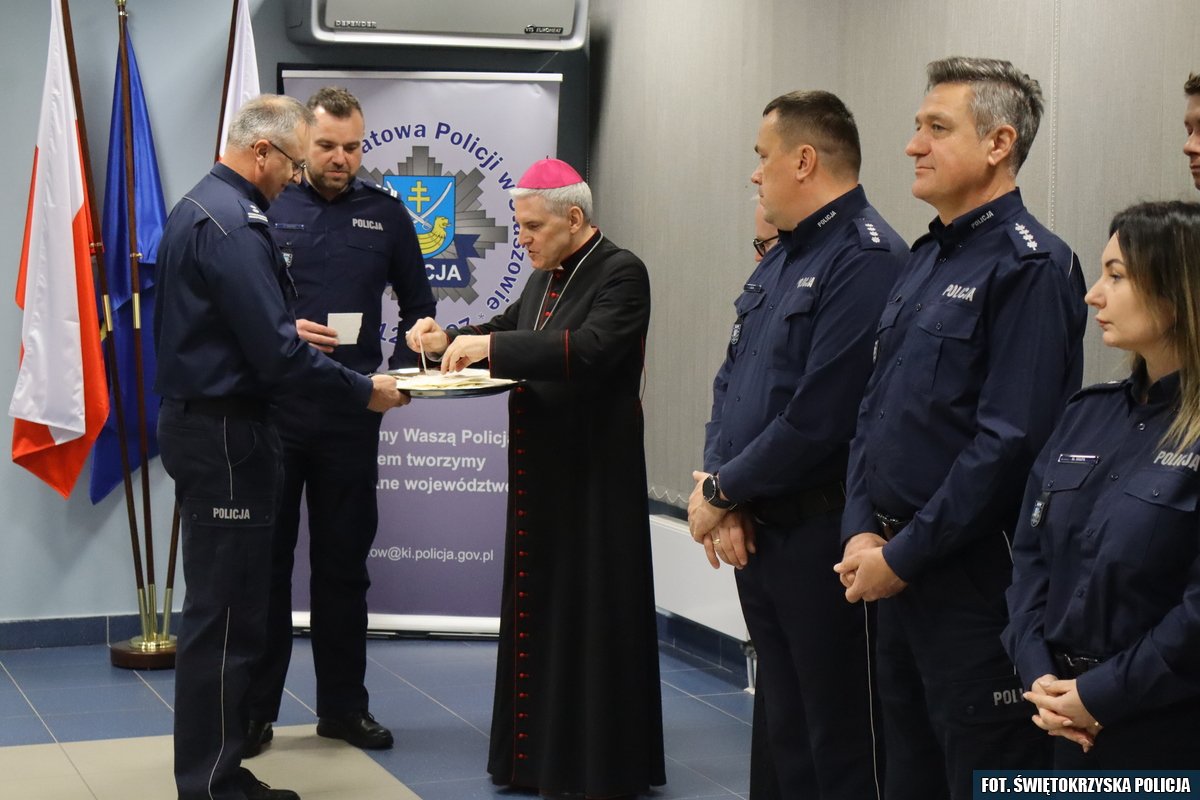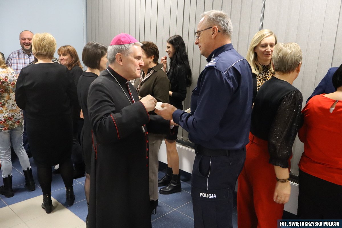 Poniedziałkowe wigilijne spotkanie rozpoczął mł.insp. Dariusz Kuroś Komendant Powiatowy Policji w Staszowie, składając wszystkim obecnym świąteczne życzenia. Komendant podziękował policjantom i pracownikom cywilnym za trudną i pełną poświęceń służbę. Natomiast wszystkim zebranym i ich rodzinom złożył świąteczne życzenia. Spotkanie opłatkowe swoją obecnością uświęcił Ksiądz Biskup Diecezji Sandomierskiej Krzysztof Nitkiewicz. Komendant Powiatowy Policji w Staszowie mł.insp. Dariusz Kuroś życzył, aby nadchodzące Święta Bożego Narodzenia były czasem spokoju, szczęścia i radości przeżywanej w gronie najbliższych. Komendant życzył, aby ten czas przyniósł wytchnienie od codziennych obowiązków.