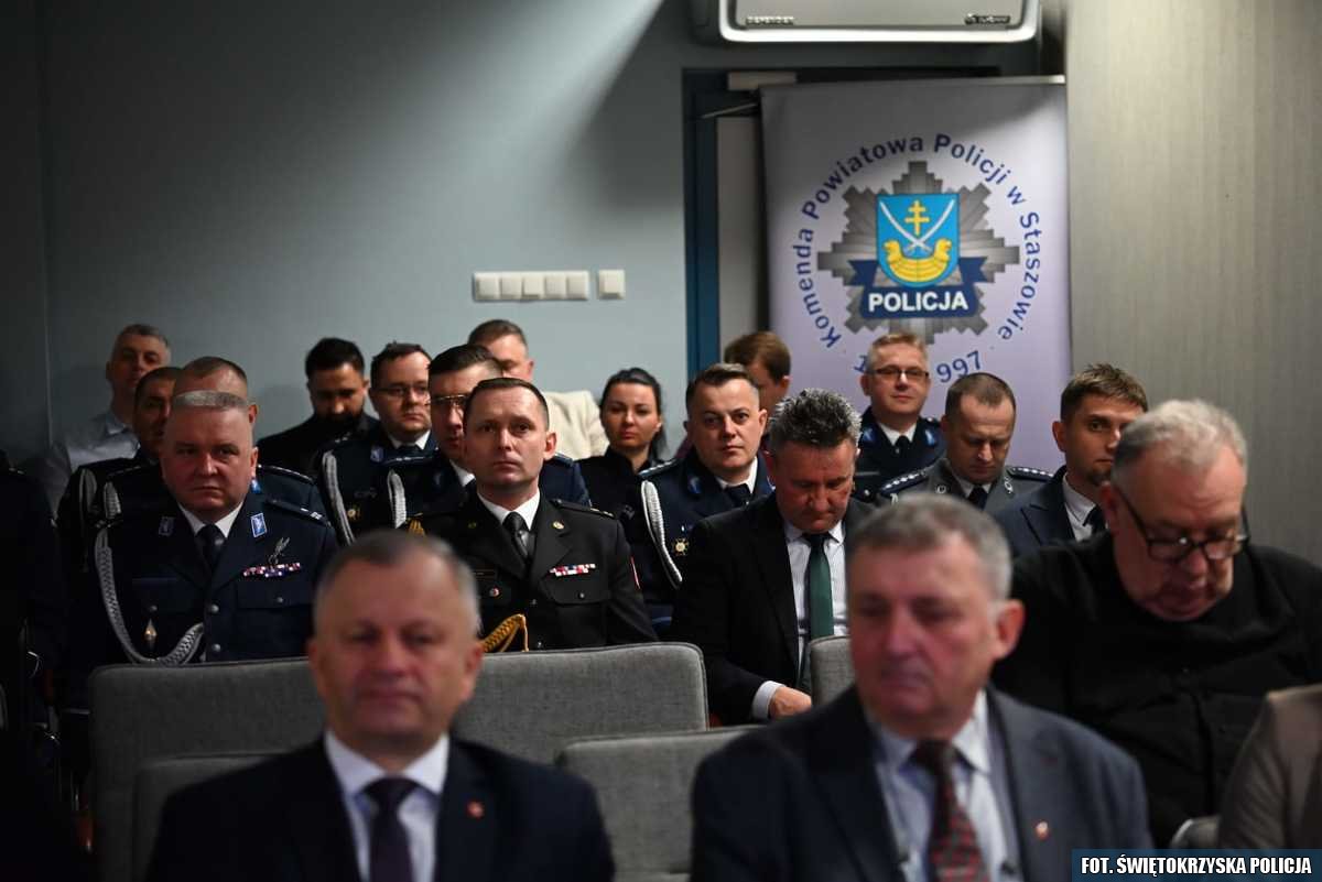 Wczoraj Sali Narad Komendy Powiatowej Policji w Staszowie odbyła się odprawa roczna podsumowująca pracę staszowskich funkcjonariuszy za ubiegły 2025 rok. W spotkaniu uczestniczył Pierwszy Zastępca Komendanta Wojewódzkiego Policji w Kielcach inspektor Tomasz Jarosz, lokalni samorządowcy, przedstawiciele prokuratury, zaprzyjaźnionych służb mundurowych i instytucji.