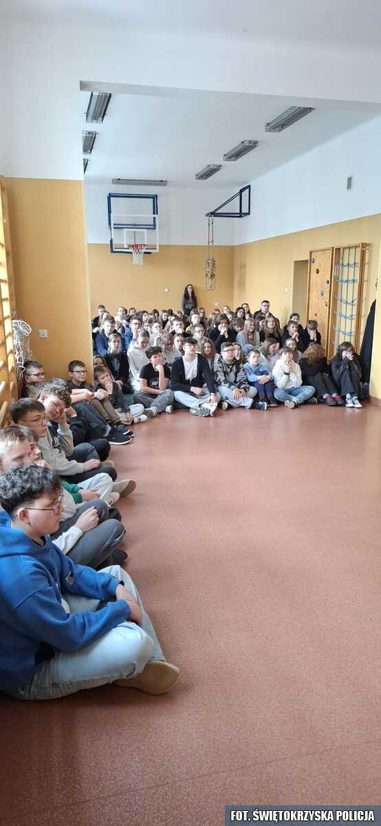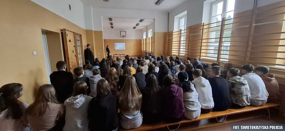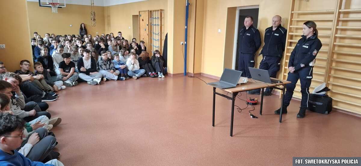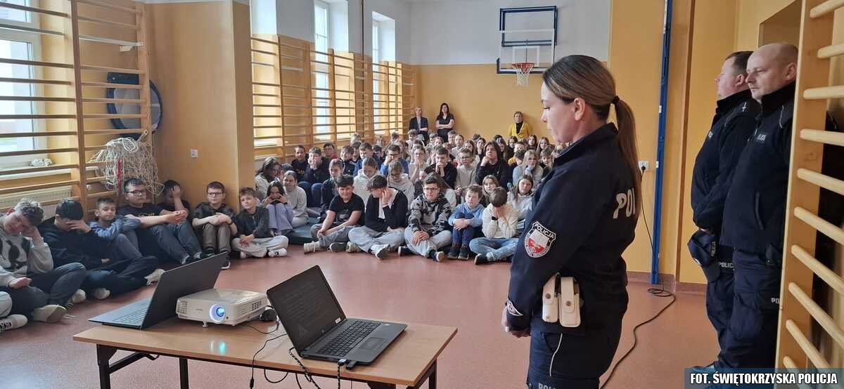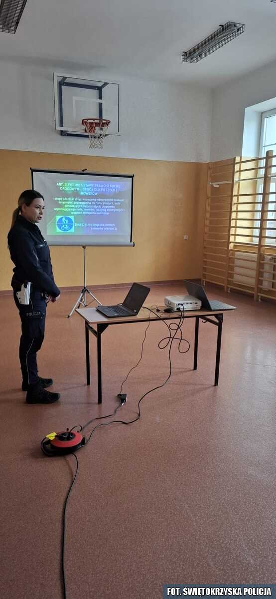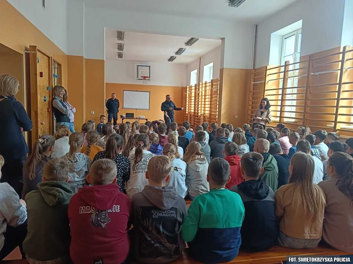 Funkcjonariusze ze staszowskiej drogówki oraz mundurowi z miejscowego posterunku Policji spotkali się z uczniami ze Szkoły Podstawowej w Szydłowie. W trakcie spotkania mundurowi przekazali dzieciom najważniejsze przepisy dotyczące bezpieczeństwa pieszych, rowerzystów, a także użytkowników hulajnóg elektrycznych. Mundurowi pokazali w jaki sposób powinno przechodzić się przez przejście dla pieszych, a także omówili najważniejsze znaki drogowe oraz sygnały, które wydaje policjant kierujący ruchem.