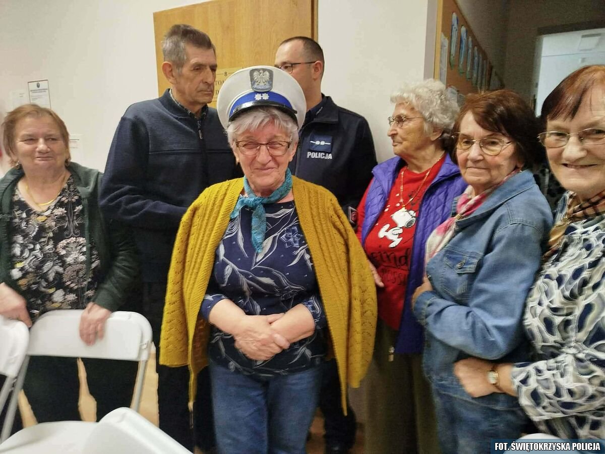 Druga część spotkania dotyczyła bezpieczeństwa w ruchu drogowym. Policjant przypomniał o zasadach prawidłowego przechodzenia przez jezdnię, znaczeniu elementów odblaskowych oraz zachowaniu ostrożności jako pieszy i kierowca. Zwrócił uwagę na to, że wraz z wiekiem czas reakcji może się wydłużać, dlatego tak ważne jest zachowanie szczególnej rozwagi.