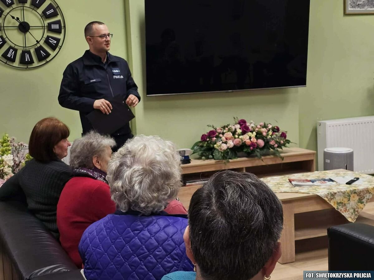 Policjant ze staszowskiej drogwki spotkał się we wtorkowe przedpołudnie z seniorami w Domu Samopomocy w Budziskach. Podczas rozmowy omówił metody stosowane przez oszustów w tym metodę oszustwa ,,na wnuczka”, ,,na policjanta” czy ,,na pracownika banku”. Funkcjonariusz wyjaśnił jak rozpoznać próbę wyłudzenia pieniędzy i gdzie szukać pomocy w przypadku podejrzenia przestępstwa.