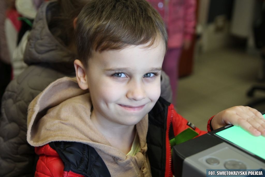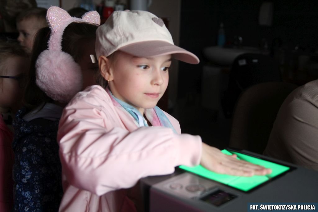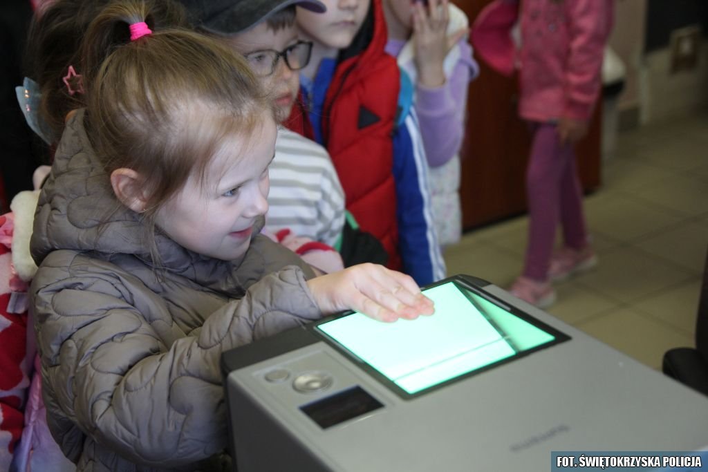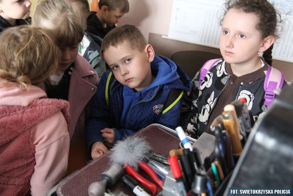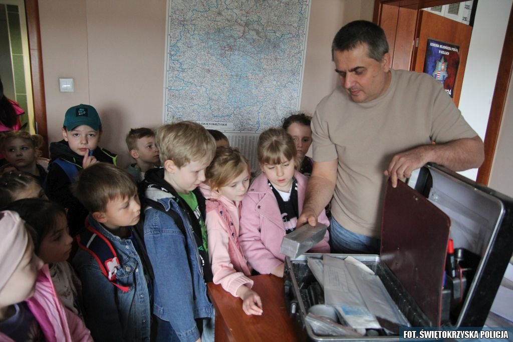 Technik kryminalistyki pokazał dzieciom walizkę pełną przedmiotów, które funkcjonariusz wykorzystuje podczas codziennej służby, a które okazały się wielką dla nich atrakcją. Wiele radości przedszkolakom sprawiła również możliwość pobrania odcisków palców, a także zobaczenia na własne oczy jak wygląda zbieranie śladów z miejsca zdarzenia.